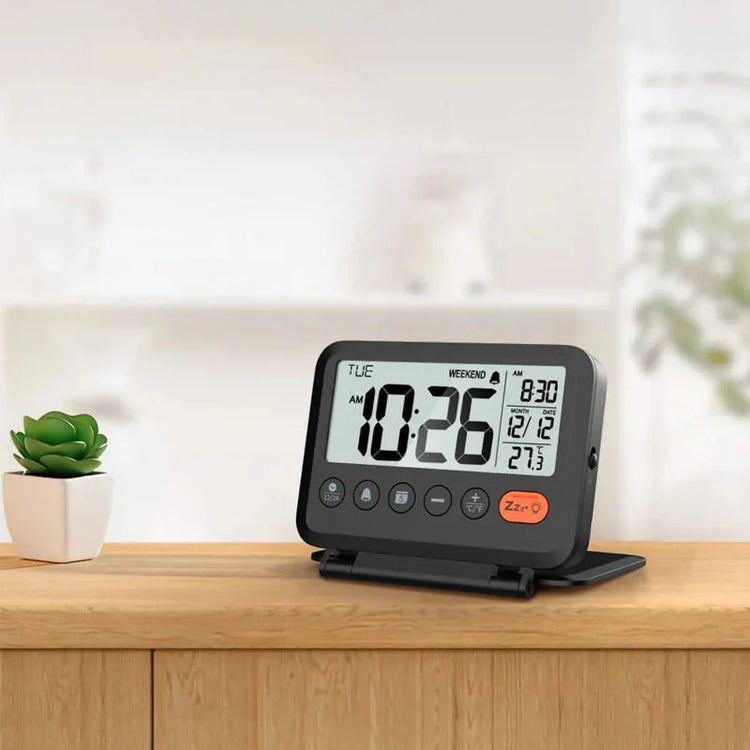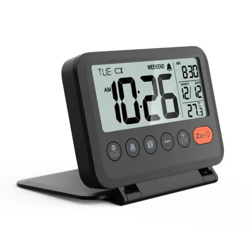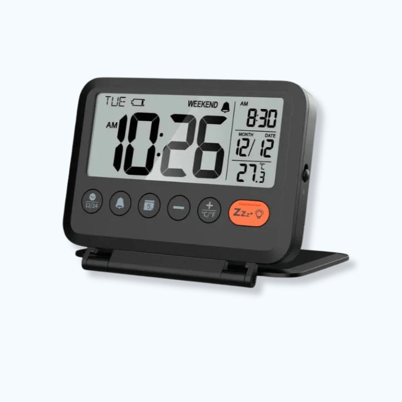 Ce petit réveil de voyage vous assure des réveils ponctuels lors de vos déplacements professionnels ou personnels. Son écran LCD large et contrasté affiche l’heure en grand format, la date complète et la température ambiante, pour vous offrir une vision globale dès le réveil.