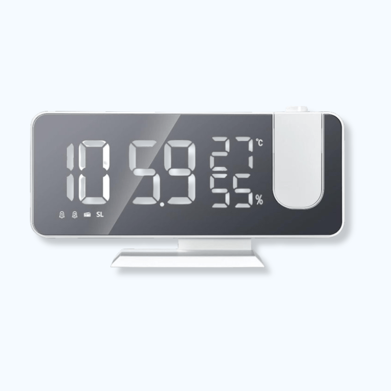 Ce radio réveil projecteur blanc séduit par son style moderne et son affichage LED miroir, s’intégrant parfaitement dans une chambre lumineuse ou minimaliste. Sa projection rotative à 180° vous permet de lire l’heure au plafond ou sur un mur sans effort.