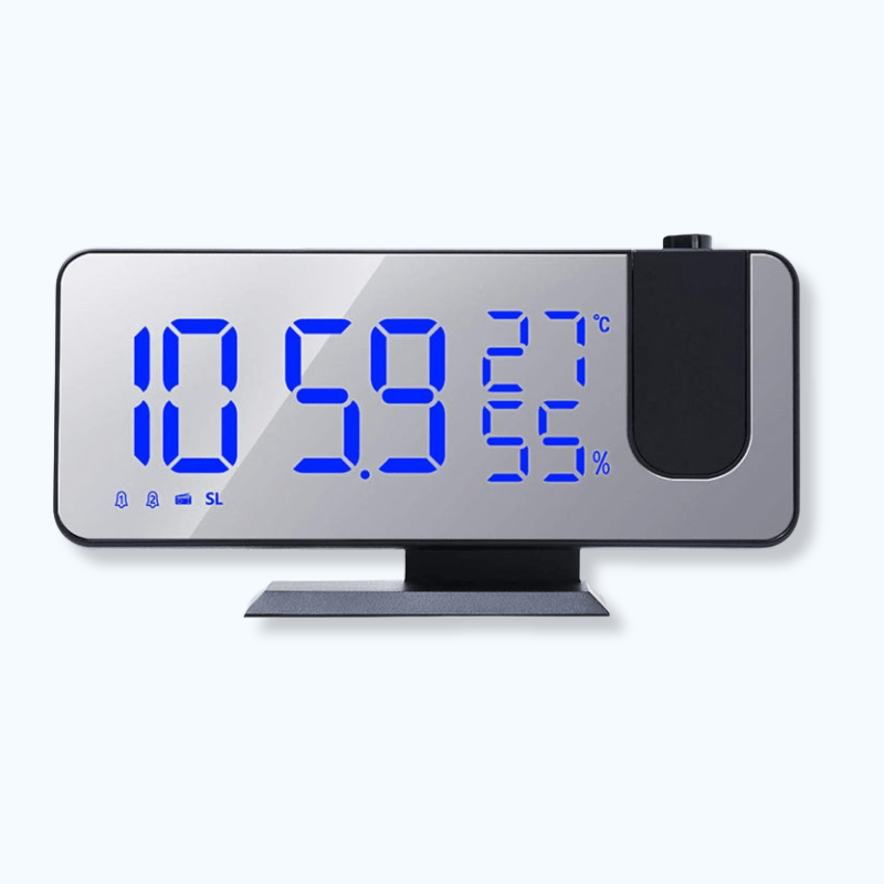 Le Radio réveil projecteur design séduit par son écran miroir à LED bleues, combinant élégance et praticité. L’heure, la température et l’humidité sont affichées en grand pour un confort immédiat, même au réveil. Sa projection rouge orientable à 180° offre une lecture nocturne sans bouger la tête ni subir d’éblouissement.