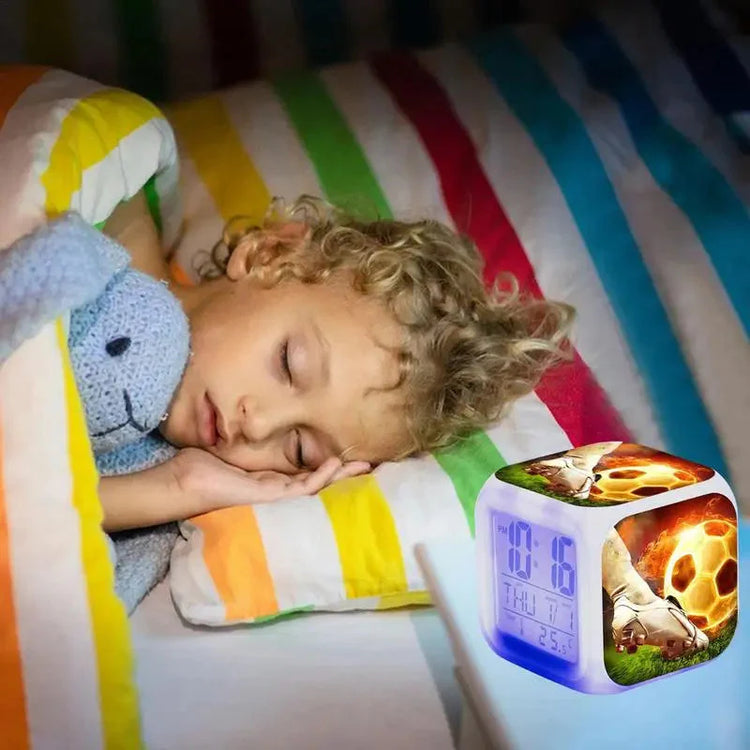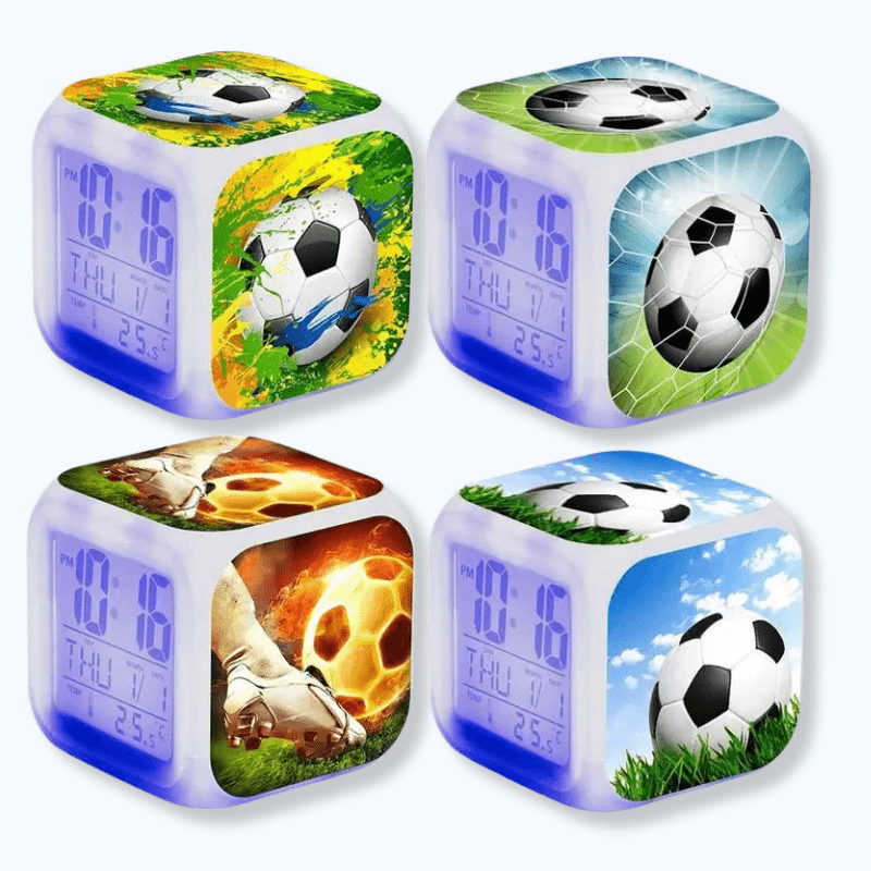Ce réveil foot digital séduit par son design unique. Son boîtier cubique affiche des motifs football dynamiques sur chaque face, rappelant la passion et l’énergie du sport. Idéal sur une table de chevet ou un bureau, il apporte une touche fun et motivante à la décoration de chambre. Conçu pour les petits et grands fans de football, il devient un véritable objet déco tout en restant pratique au quotidien.
