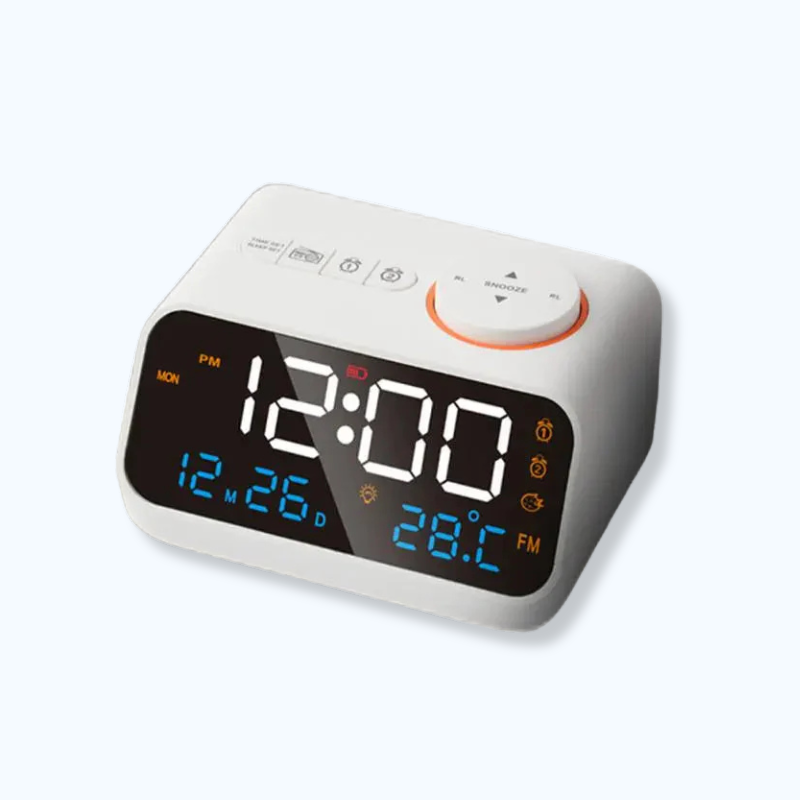Le réveil numérique batterie avec radio n’est pas un simple réveil. Il propose un affichage LED clair qui indique l’heure, la date et la température ambiante, idéal pour organiser vos journées dès le réveil. Sa batterie rechargeable offre une autonomie longue durée, parfaite même en cas de coupure électrique. Sa radio FM intégrée vous permet d’écouter vos stations préférées au réveil ou pendant la journée. Facile à régler grâce à son bouton rotatif intuitif, il devient rapidement un allié pratique au quotidien.