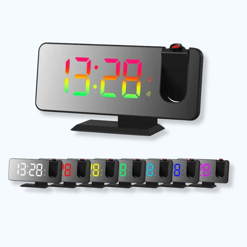 La force de ce réveil projecteur secteur, c’est son affichage LED grand format aux chiffres colorés et lumineux. Il reste parfaitement lisible, même dans l’obscurité, sans agresser les yeux. Sa fonction de projection horaire sur le plafond ou le mur te permet de connaître l’heure d’un simple regard, sans bouger de ton oreiller.